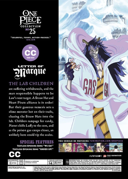 The lab children are suffering withdrawals, and the man responsible happens to be Law’s next target. A Straw Hat and Heart Pirate alliance is in order! But their gaseous nemesis sets a slime monster hot on their trails, chasing the Straw Hats into the lab. Children rampage for candy, Monet chills Luffy to the core, and as the poison gas creeps closer, an unlikely hero could tip the scales.