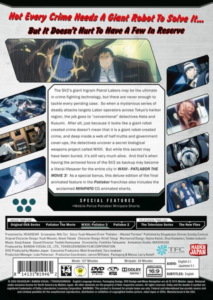 The SV2’s giant Ingram Patrol Labors may be the ultimate in crime-fighting technology, but there are never enough to tackle every pending case. So when a mysterious series of deadly attacks targets Labor operators across Tokyo’s harbor region, the job goes to “conventional” detectives Hata and Kusumi.