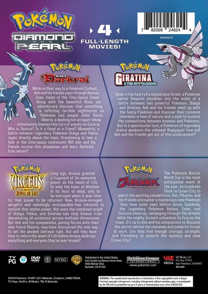 Pokémon Diamond and Pearl Movie 4-Pack contains Pokemon Movies 10-13 – The Rise of Darkrai; Giratina and the Sky Warrior; Arceus and the Jewel of Life; and Zoroark: Master of Illusions.